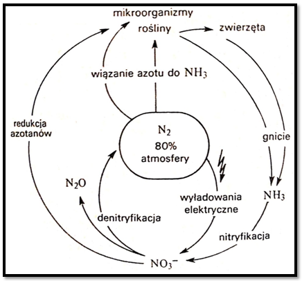 Największym i nieograniczonym źródłem azotu jest atmosfera. Nad każdym hektarem powierzchni unosi się słup powietrza zawierający 80tyś. ton N2. Jednak tylko stosunkowo nieliczna grupa organizmów może korzystać z azotu atmosferycznego. Natomiast olbrzymia reszta roślin może żyć i rozwijać się jedynie dzięki mechanizmowi, który umożliwia im pobieranie azotu od innych organizmów, przede wszystkim z produktów ich rozkładu oraz w niewielkim stopniu  z opadów atmosferycznych (tlenki azotu tworzone na wyładowaniach).